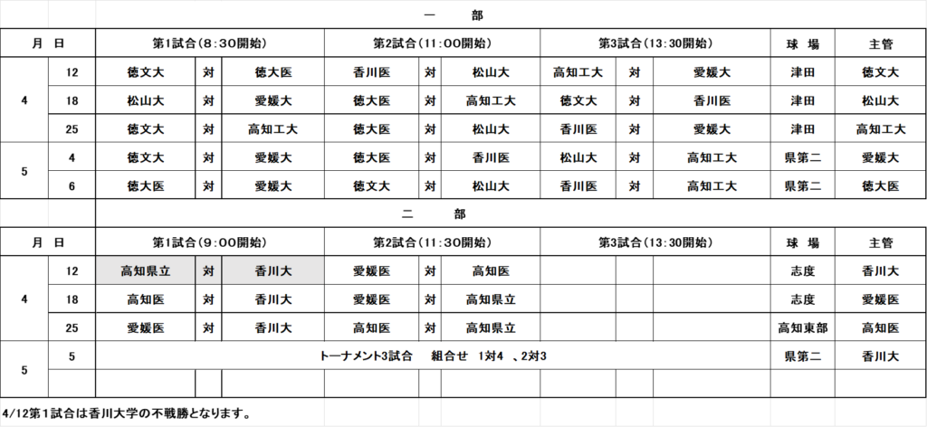 令和7年度秋季大会が上記の内容で開催されました。各大学とも新メンバーでの対戦となりました。総合力で他大学を圧倒した愛媛大学が、見事優勝しました。おめでとうございます。運営していただいた各大学の選手、マネージャーに感謝いたします。この結束力を生かし、11/14~15に香川県で開催される9ブロック大会で四国地区一丸となり、甲子園での決勝を目指しましょう!